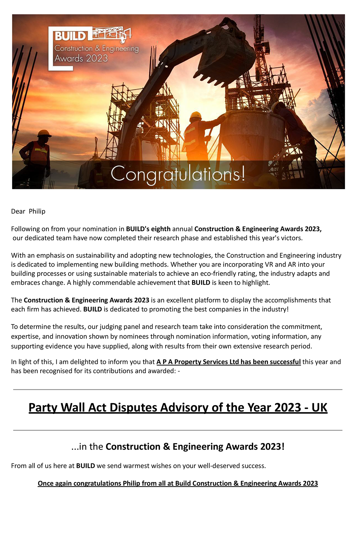 The panel at BUILD, after an extensive research period, recognises Dr. Philip Antino and APA Property's contributions and awarded them Party Wall Act Disputes Advisory of the Year 2023.